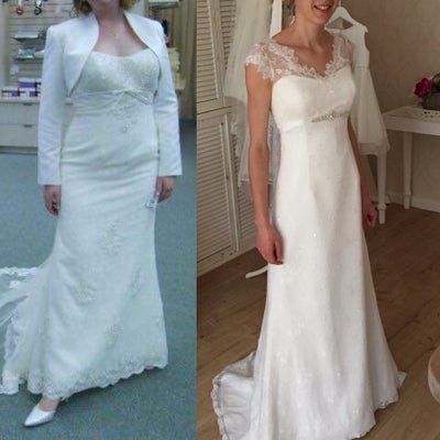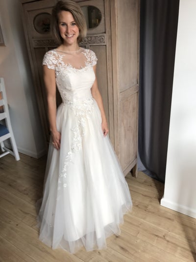 Aangepaste zijde jurk met tulle rok en kanten lijfje.