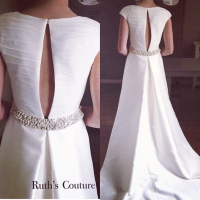 Crepe trouwjurk met sleep en knoopjes en lage rug.