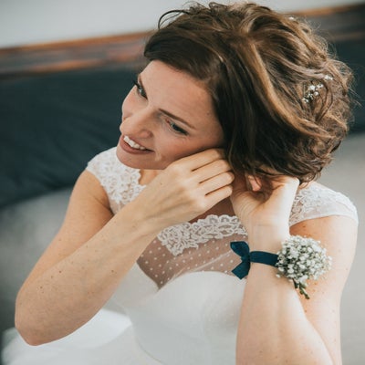 Aangepaste trouwjurk van moeder met een bijpassende sluier.